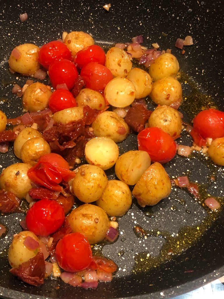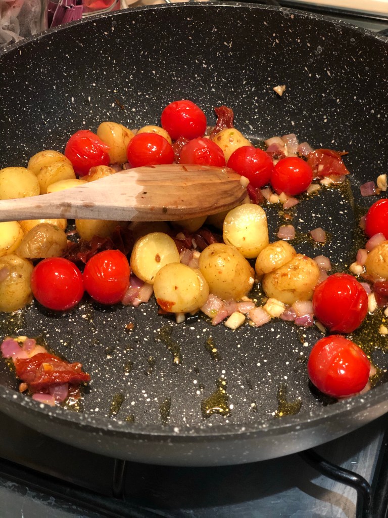 After the chicken and rustic potato wedges have cooked, quickly heat up the tomatoes mix for another four minutes.