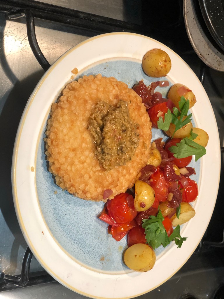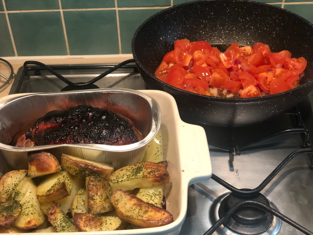 Place the tomatoes frying pan mix to one side and turn off the heat on the hob.