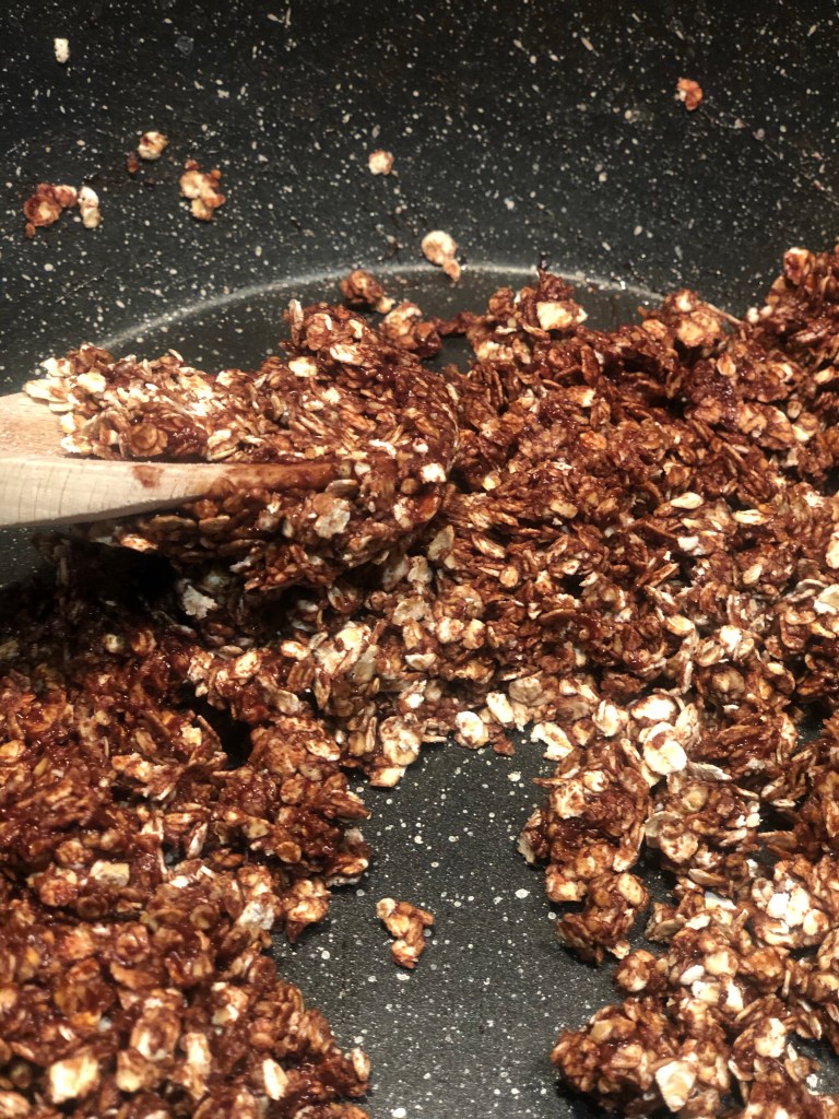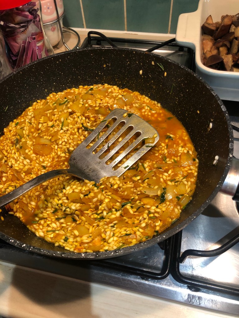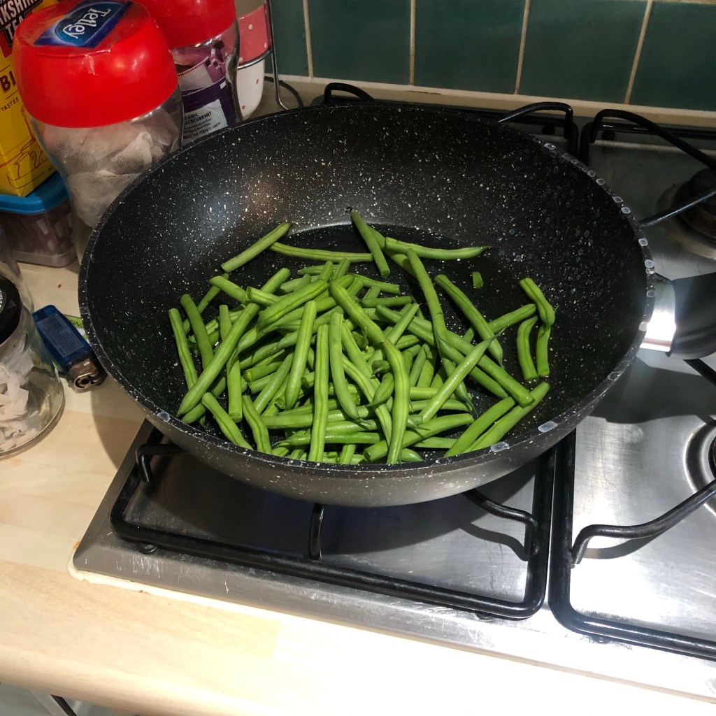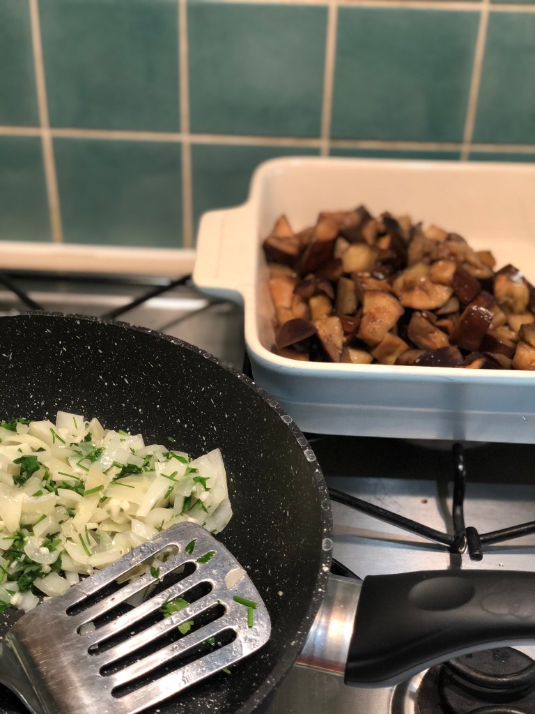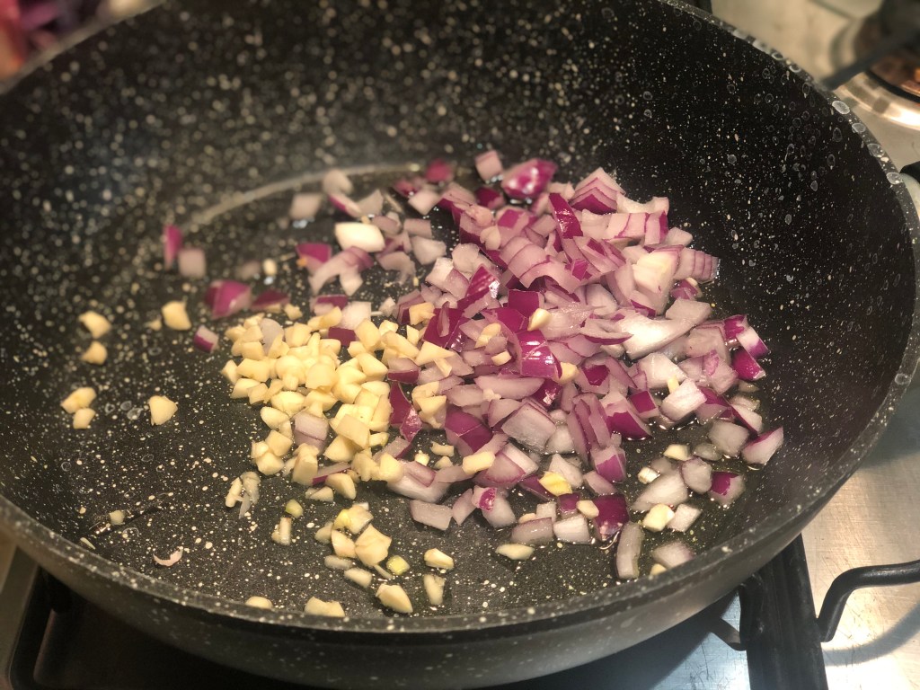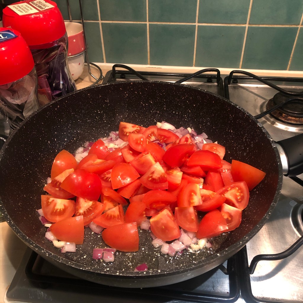 Heat the second and final half of the Olive oil in a frying pan. Add the onion and garlic, & cook for five minutes until the heavenly ‘kitchenny’ smell starts to take effect.