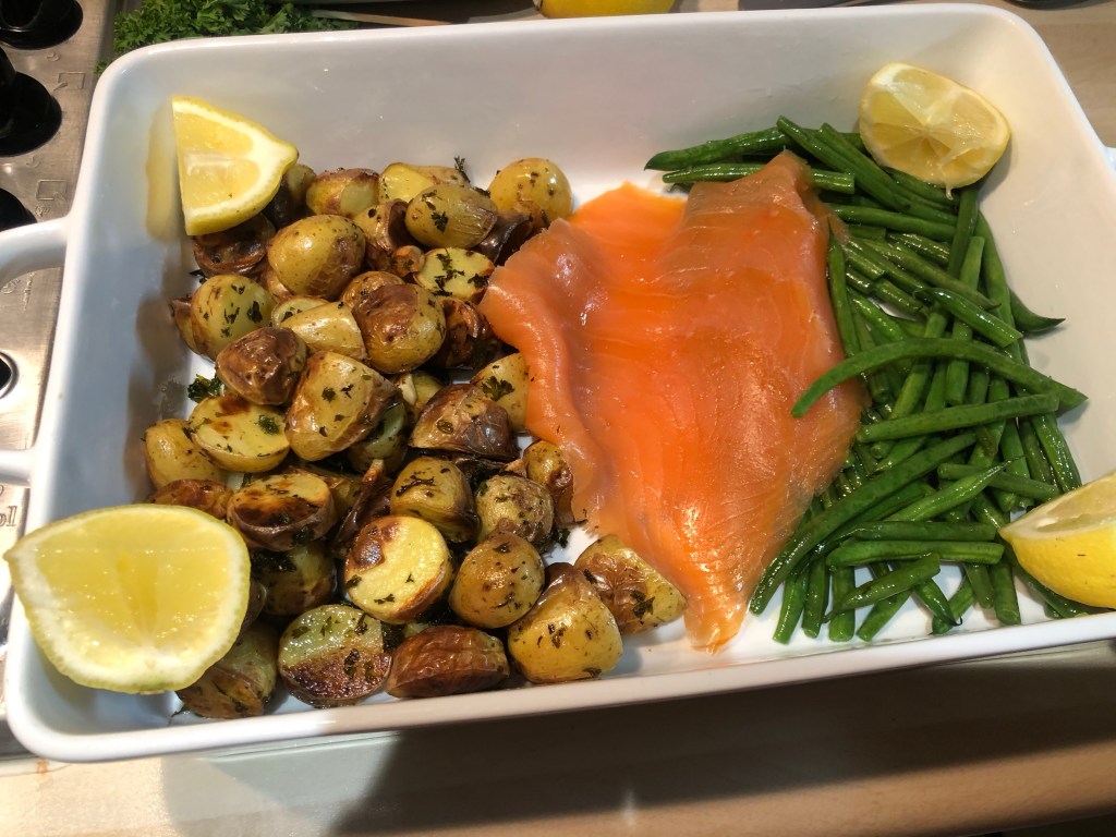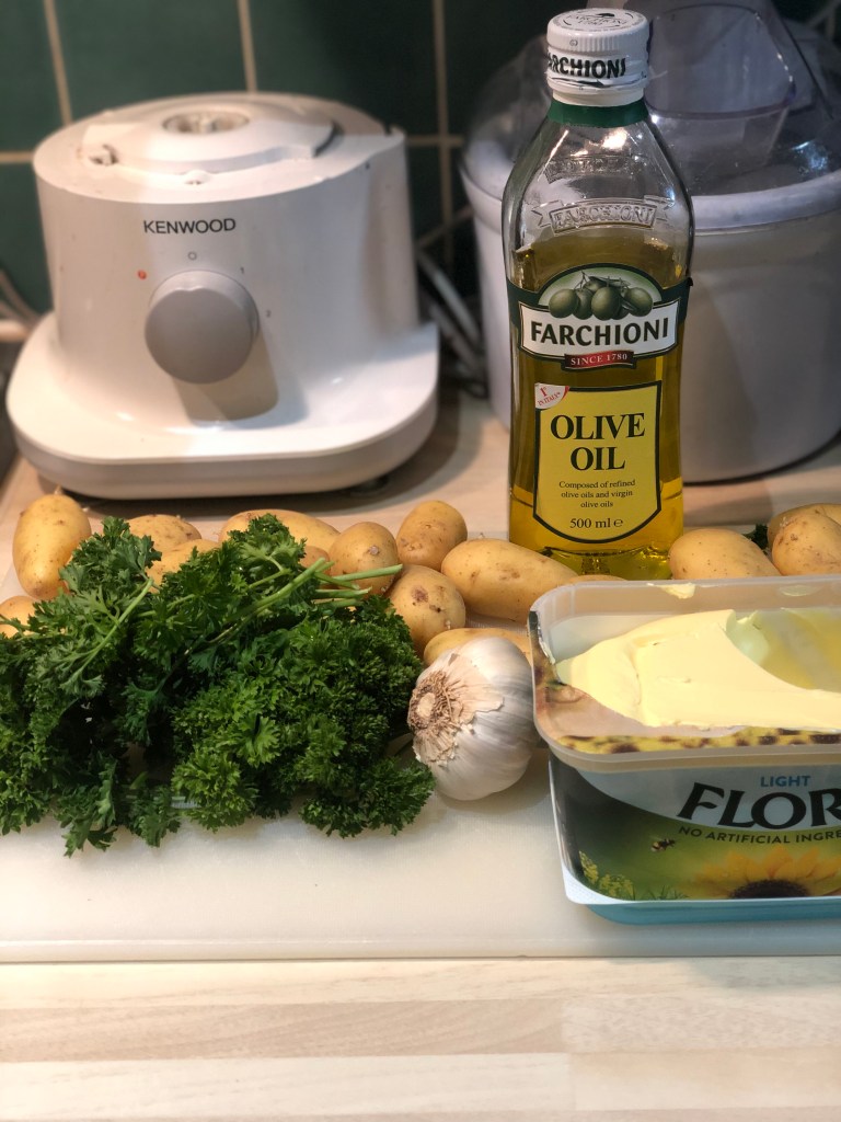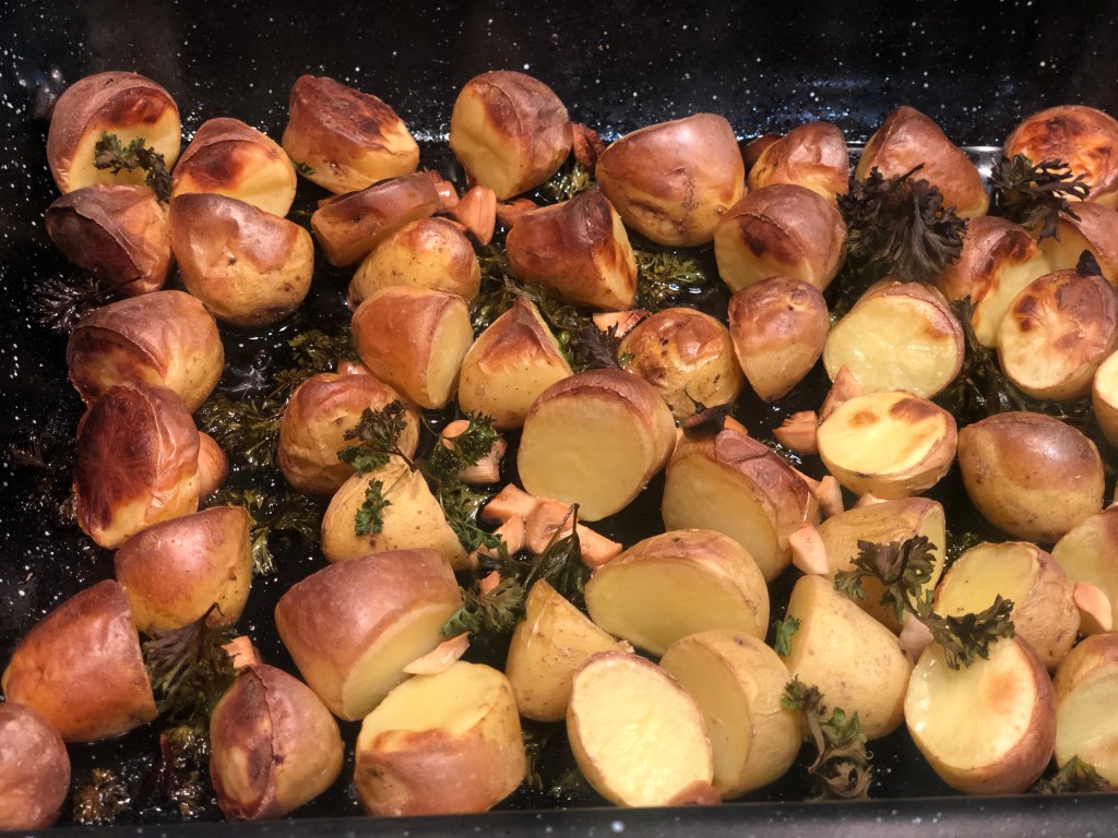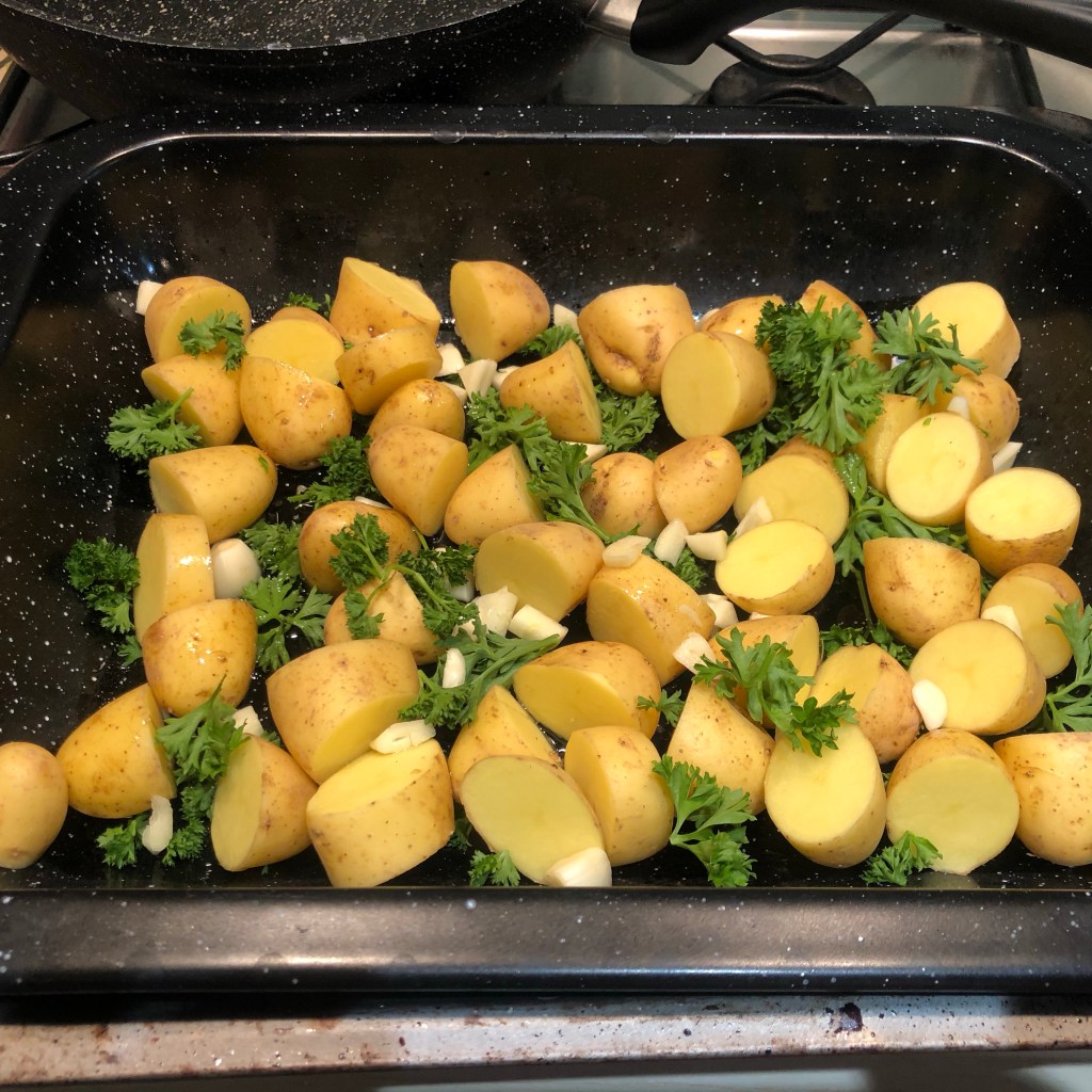 Place the chicken into a baking tin and add the potatoes, drenching in olive oil, sea salt & dried parsley. Heat potatoes and chicken on 220 for an hour.