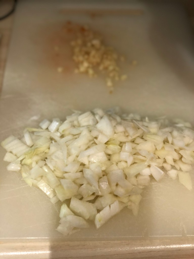 Heat the second and final half of the Olive oil in a frying pan. Add the onion and garlic, & cook for five minutes until the heavenly ‘kitchenny’ smell starts to take effect.