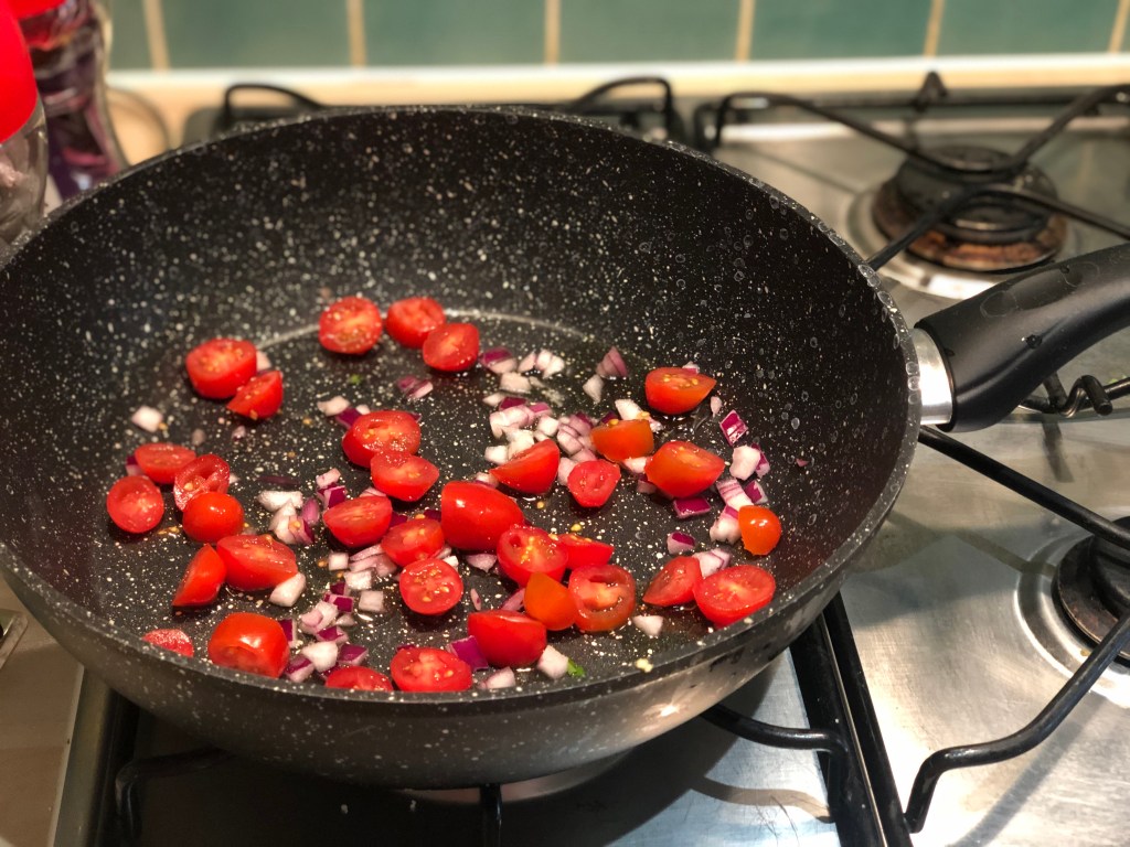 Place the tomatoes frying pan mix to one side and turn off the heat on the hob.