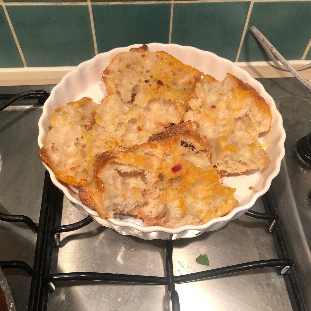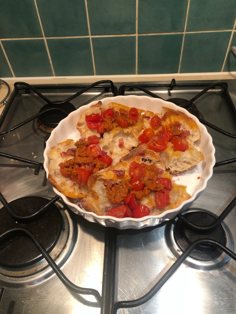 Next, Add the bread, doughy part facedown to the frying pan for two mins, allowing it to soak up the flavoursome olive oil, and flavours of onion and tomato.